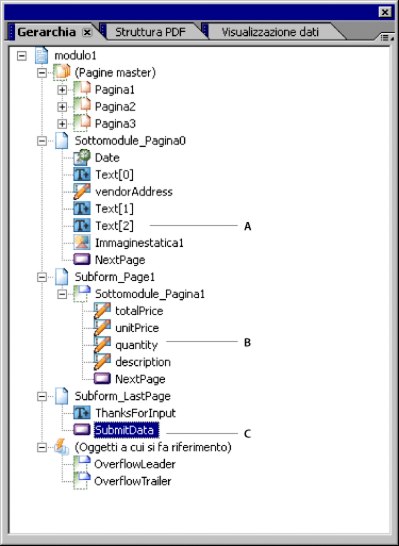 - Il sottomodulo Subform_Page0 posiziona il contenuto ed è impostato per visualizzare gli oggetti che lo compongono sulla prima pagina del modulo, utilizzando il layout della pagina master Page1.
