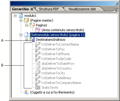 Riferimenti al frammento nella palette GerarchiaNella palette Gerarchia gli oggetti contenuti in un riferimento a un frammento sono disattivati, perché non possono essere selezionati o modificati direttamente dal riferimento al frammento.