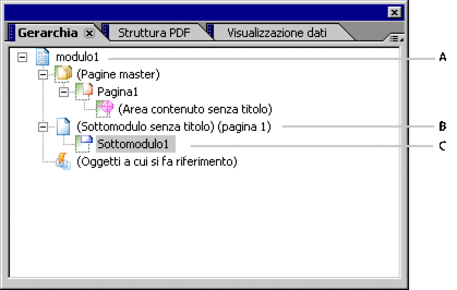 Designer aggiunge automaticamente a ciascuna pagina un sottomodulo predefinito che occupa l'intera pagina e corrisponde all'area contenuto predefinita nella pagina master per dimensioni e posizione. Tutti i sottomoduli successivamente aggiunti alle pagine vengono nidificati e visualizzati sotto il sottomodulo pagina predefinito nella palette Gerarchia