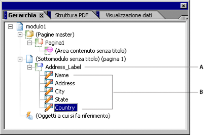 Nella palette Gerarchia, ogni sottomodulo è rappresentato da un nodo, mentre gli oggetti racchiusi in un sottomodulo sono visualizzati sotto il nodo del sottomodulo. Gli elementi secondari di un sottomodulo non ereditano le modifiche effettuate a livello del sottomodulo; le proprietà di ciascun oggetto vanno definite singolarmente.