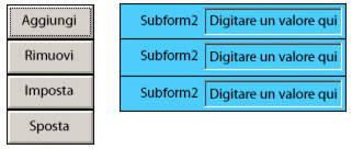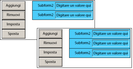 Nota: Il pulsante Sposta riordina le prime due istanze Subform2 e il pulsante Imposta visualizza il numero massimo di istanze Subform2. In entrambi i casi, può essere necessario aggiungere o rimuovere sottomoduli, oppure apportare modifiche ai dati nei campi di testo per visualizzare le modifiche apportate alle istanze Subform2.