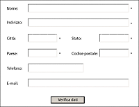 In questo esempio, viene visualizzato un asterisco (*) a destra dei campi obbligatori. Quando un campo è selezionato, il bordo del campo è di colore blu. Se il compilatore fa clic sul pulsante Verifica dati senza aver compilato i campi obbligatori, viene visualizzato un messaggio e il campo diventa rosso. In caso siano stati compilati tutti i campi obbligatori, quando il compilatore fa clic sul pulsante Verifica dati viene visualizzato un messaggio di conferma.