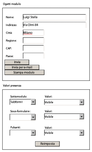 Questo esempio illustra come nascondere i pulsanti durante la stampa di un modulo, e come nascondere e mostrare gli oggetti modificando i valori di presenza durante l'esecuzione.