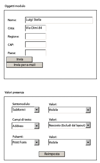 Per mostrare o nascondere gli oggetti, il compilatore può utilizzare gli elenchi a discesa all'interno dell'area Valori di presenza. Nel diagramma seguente, il campo Indirizzo è nascosto e il layout modulo si è modificato di conseguenza. Anche il pulsante Stampa modulo è invisibile.