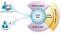 Una volta terminata la creazione dei modelli e dei modelli dei dati, viene creato un terzo modello, il DOM modulo, che rappresenta le informazioni unite. Il DOM modulo agisce come mezzo per unire i valori specifici dei dati XML con le regole di presentazione definite dalla struttura del modulo.
