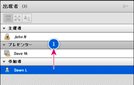 出席者ポッドには、パスワードを指定してログインしている Adobe Connect ユーザーのフルネームが表示されます。名前は Adobe Connect Central に登録されたとおりに表示されます。出席者がゲストとして会議にログインした場合、出席者ポッドに表示される名前は、ゲストとしてログインしたときに入力した名前です。役割グループ(主催者、プレゼンター、参加者)内では、出席者名はアルファベット順に並びます。