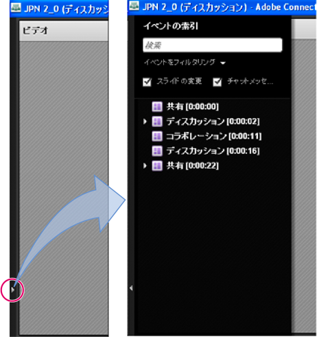 録画された会議のウィンドウの左側にある三角をクリックすると、「イベントの索引」ペインが表示されます。