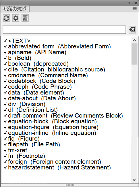 カタログは、現在の位置で有効なエレメントのみを表示するようにあらかじめ設定されていますが、より多くのエレメントを表示することもできるので柔軟性を高められます。 カタログは、非構造化フロー内でクリックまたは選択した場合、文書にエレメント定義が含まれていない場合、または現在の位置でそれ以上エレメントを必要としていない場合は、空です。