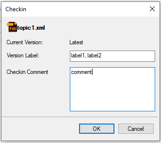 FrameMaker を使用すると、XML ドキュメントソリューションファイルをチェックインする際にも、ラベルを追加できます。これらのラベルは XML ドキュメントソリューションで定義されており、FrameMaker でドロップダウンリストとして表示されます。詳細については、Adobe Experience Manager 用 XML ドキュメントユーザーガイドで、「ラベルの追加」セクションを参照してください。