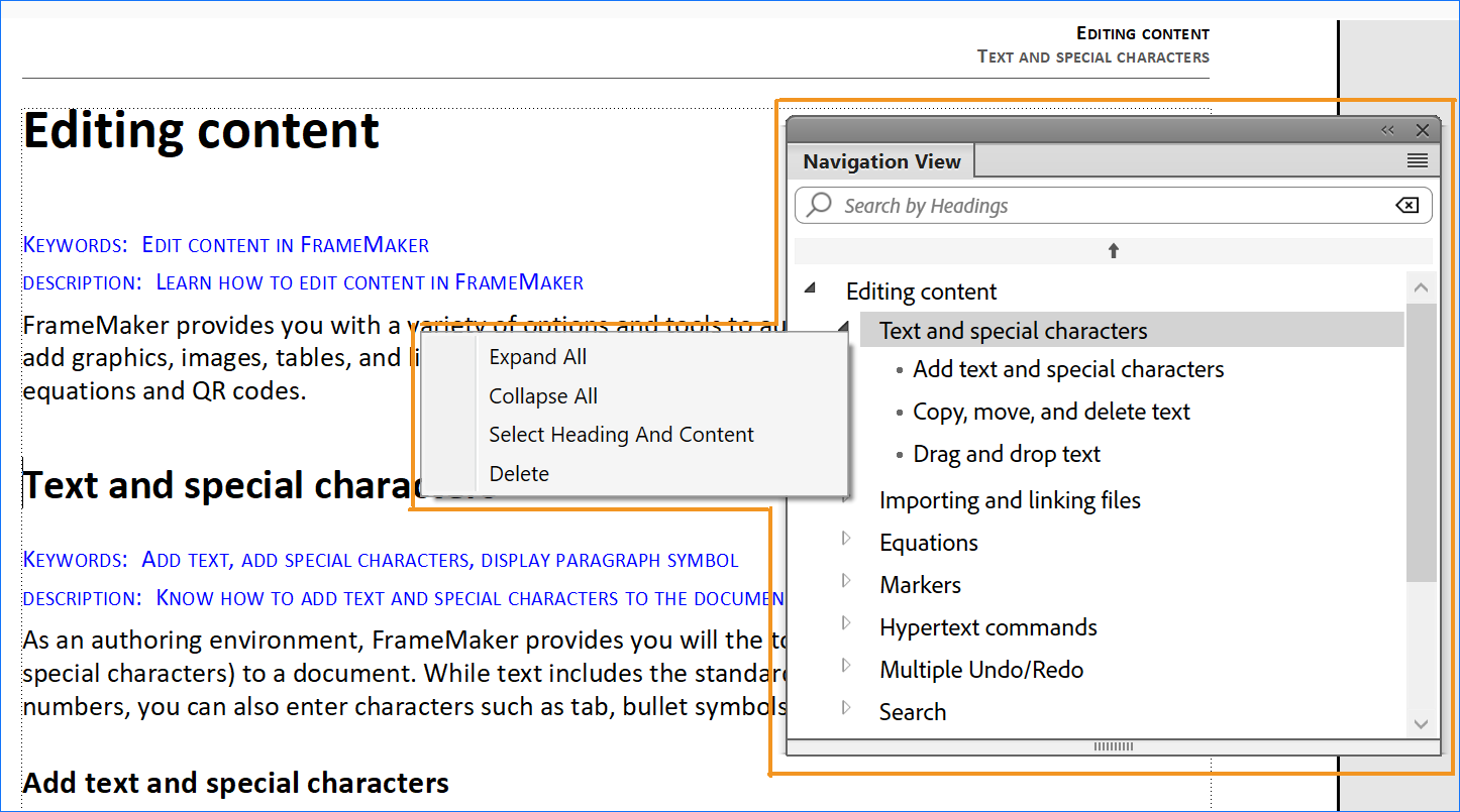 ドキュメントの構造を確認するには、メインメニューからに移動するか、Esc + n + v のショートカットキーを使用してナビゲーションビューを起動します。