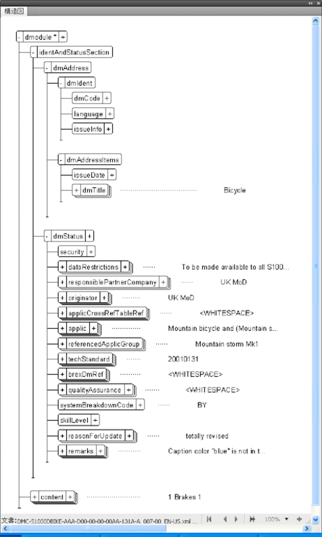 データモジュールの構造すべてのデータモジュールは、identAndStatusSection と content の 2 つの主なセクションを持っています。 ![]() データモジュールの構造 identAndStatusSection は、データモジュールを管理するために CSDB によって使用される広範なメタデータエレメントを持っています。idstatus は通常、出版物のユーザーに対しては表示されず、作成者によっても編集できない場合がしばしばあります。以下の構造表示は idstatus エレメントを示しています。idstatus セクションの詳細な説明については、S1000D 仕様の 3.9.5.1 章を参照してください。 ![]() idstatus セクションの構造 identAndStatusSection の使用可能なエレメント構造はすべてのデータモジュールに対して同一ですが、content セクションはデータモジュールの各タイプごとに異なります。content セクションは、IETP または印刷に表示されるデータモジュールの部分です。 |