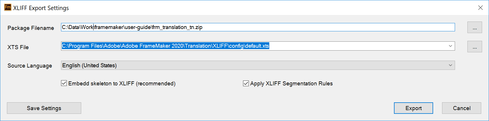 XLIFF 書き出し設定ダイアログの設定は、.xts ファイルにすべて保存されます。このファイルは、その後の翻訳プロジェクトで再利用できます。