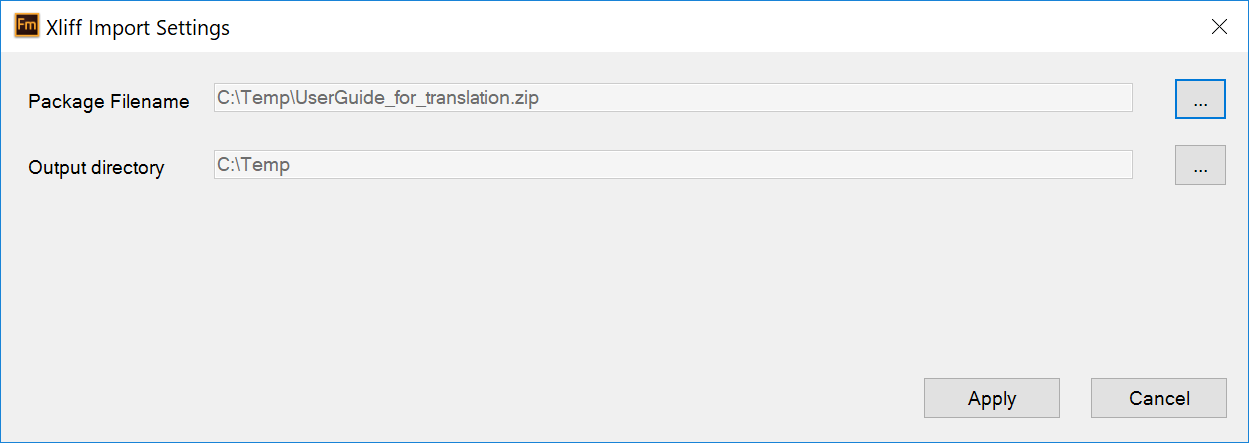 XLIFF 取り込み設定ダイアログで、翻訳サービスプロバイダーから受け取ったパッケージのファイル名を指定します。