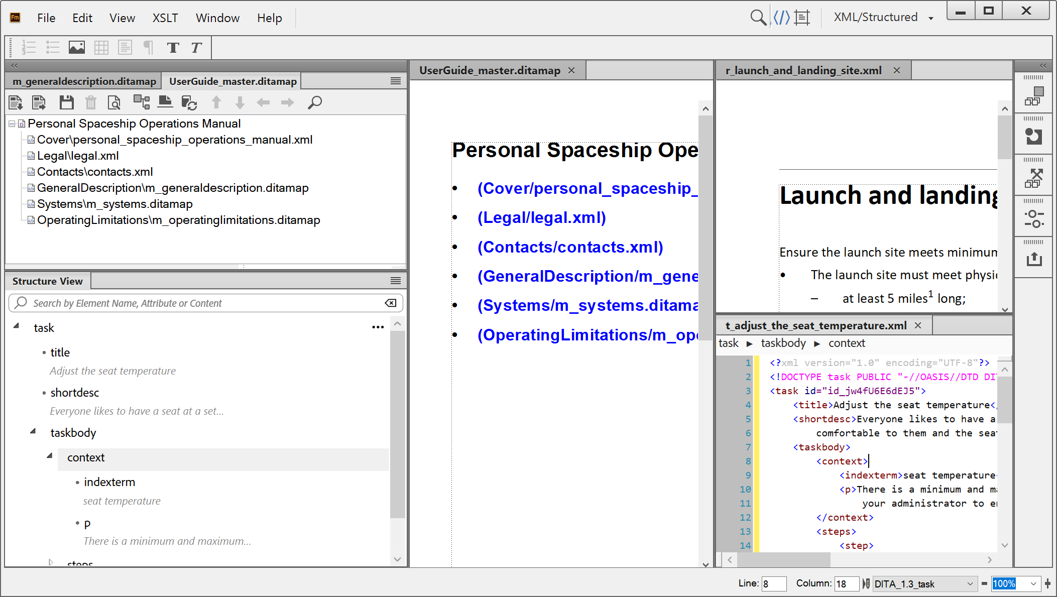 The latest release of FrameMaker allows you to work in the Document View while retaining the book or DITA map view. This means that you can now work on all views — WYSIWYG, Document View, or XML View at the same time without losing out on the book view. |