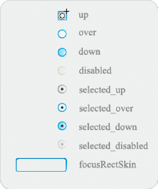 Jeśli składnik RadioButton jest włączony, ale nie jest zaznaczony, po przesunięciu na niego wskaźnika wyświetlana jest karnacja over. W momencie kliknięcia składnika RadioButton składnik jest aktywowany do wprowadzania i wyświetlana jest jego karnacja selected_down. W momencie zwolnienia przycisku myszy dla składnika RadioButton zostanie wyświetlona karnacja selected_up. Jeśli wskaźnik z wciśniętym przyciskiem myszy zostanie przesunięty poza obszar klikania składnika RadioButton, wyświetlona zostania karnacja up