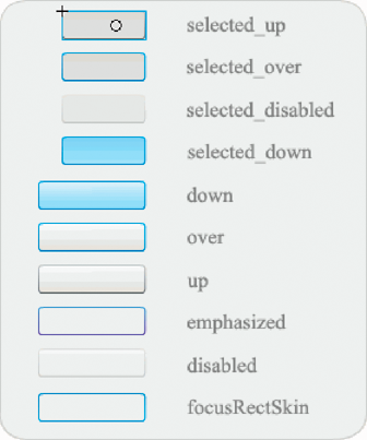 Składniki interfejsu użytkownika w języku ActionScript 3.0 są plikami w formacie FLA zawierającymi wbudowane karnacje. Dostęp do składników można uzyskiwać, klikając je dwukrotnie na stole montażowym. Karnacje składnika i pozostałe zasoby są umieszczone na klatce nr 2 osi czasu. Gdy użytkownik kliknie dwukrotnie składnik, program Flash automatycznie przechodzi do klatki nr 2 i otwiera paletę karnacji składnika. Na poniższej ilustracji przedstawiono paletę karnacji wyświetlaną w przypadku składnika Button.