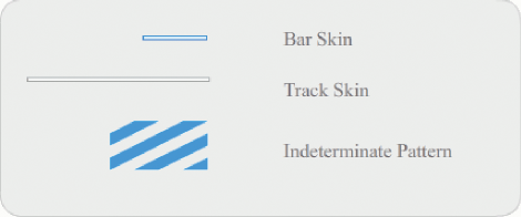 O componente ProgressBar usa capas para representar a faixa da barra de progresso, a barra concluída e uma barra indeterminada, conforme mostrado na ilustração a seguir.