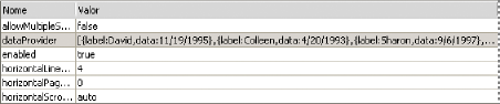 no ambiente de criação. O componente DataGrid não tem um parâmetro dataProvider no Inspetor de propriedades porque ele tem várias colunas e, conseqüentemente, seu provedor de dados é mais complexo. Você também pode usar o ActionScript para criar um DataProvider para esses componentes, bem como para a DataGrid.