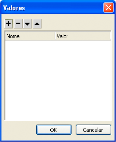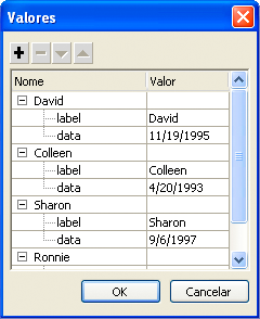 Clique no sinal de adição para adicionar um item ao parâmetro dataProvider. Clique no sinal de subtração para excluir um item. Clique na seta para cima a fim de mover um item selecionado para cima na lista ou clique na seta para baixo a fim de mover um item selecionado para baixo na lista. A ilustração a seguir mostra a caixa de diálogo Valores que cria uma lista de nomes de crianças e suas datas de aniversário.