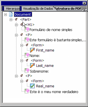 Paleta Exibição de dadosSe houver uma conexão de dados, a paleta Exibição de dados exibirá a hierarquia derivada dessa conexão. Os nós superiores na hierarquia representam cada conexão de dados e exibem o nome da conexão de dados. Uma conexão de dados fornece um vínculo entre uma fonte de dados e um formulário.
