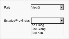 Por exemplo, depois que você seleciona Vietnã na primeira lista suspensa, os itens relacionados na lista Estados/municípios mostra somente os que se aplicam a Vietnã.