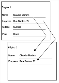 Este diagrama mostra o que acontece quando vários campos são definidos como campos globais. O nome e endereço são preenchidos na Página 2, depois que o usuário digita o nome e o endereço na Página 1.