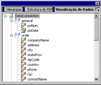 A paleta Visualização de dados exibe uma visualização em hierarquia da cada fonte de dados. O nó superior na hierarquia representa a conexão de dados e exibe o nome atribuído quando a conexão foi criada.