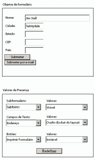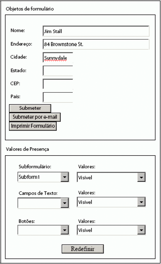 O usuário pode usar as listas suspensas na área Valores de presença para mostrar ou ocultar os objetos. No diagrama a seguir, o campo Endereço está oculto e o layout do formulário foi ajustado adequadamente. O botão Imprimir Formulário também não está visível.