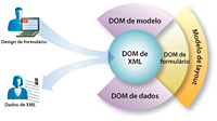 Depois que o modelo e os modelos de dados são criados, um terceiro modelo, o DOM do formulário, é criado, representando a união das informações. O DOM do formulário atua como um meio de combinação de valores específicos dos dados XML com as regras de apresentação definidas pelo design do formulário.