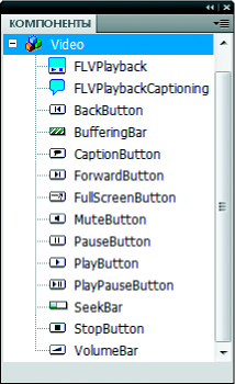 Компонент FLVPlayback содержит компоненты пользовательского интерфейса для воспроизведения FLV-файлов. Компонент FLVPlayback сочетает в себе область отображения, или видеопроигрыватель, в котором выполняется просмотр видеофайла, а также элементы управления, которые позволяют управлять проигрывателем. Компоненты пользовательского интерфейса для воспроизведения FLV-файлов имеют кнопки управления и механизмы, при помощи которых можно воспроизводить, останавливать, ставить на паузу видеофайл и другим образом управлять им. Эти элементы управления включают в себя следующие: BackButton, BufferingBar, CaptionButton (для компонента FLVPlaybackCaptioning), ForwardButton, FullScreenButton, MuteButton, PauseButton, PlayButton, PlayPauseButton, SeekBar, StopButton и VolumeBar. Компонент FLVPlayback и элементы управления воспроизведением FLV-файлов отображаются на панели «Компоненты», как показано на рисунке ниже: