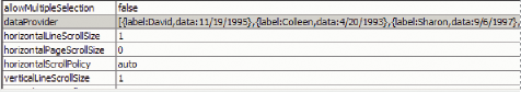 в среде разработки. Компонент DataGrid не имеет параметра dataProvider в Инспекторе свойств, так как он содержит несколько столбцов, в результате чего требуется более сложный поставщик данных. Кроме того, можно использовать ActionScript, чтобы создать DataProvider для этих компонентов, включая DataGrid.