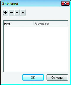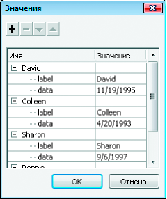 Щелкните знак «+», чтобы добавить элемент в свойство dataProvider. Щелкните знак «-», чтобы удалить элемент. Щелкните стрелку вверх, чтобы переместить выделенный элемент вверх по списку, или стрелку вниз, чтобы переместить его вниз. На следующем рисунке показано диалоговое окно «Значения», в котором создается список имен и дней рождения детей.