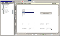I det här exemplet binds knappen Hämta post och listrutan till databasen (DataConnection) som visas på paletten Datavy till vänster. Ett FormCalc-skript är också kopplat till knappen. Skriptet hämtar information baserat på vilket artikelnummer som markerats i listrutan. Posterna som hämtas visas i fälten ID, ARTIKEL_NR, STYCKPRIS och BESKRIVNING.