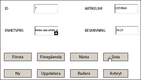 Klicka på de olika knapparna, så visas data för de olika posterna. I exemplet visas att knappen Sista leder till att ID, artikelnummer, beskrivning och styckpris för den sista posten visas i fälten.