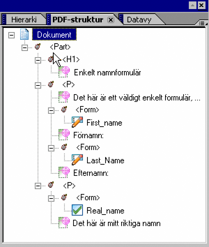 PDF-struktur (palett)Paletten PDF-struktur visar en vy över ett taggat PDF-dokuments hierarkiska struktur, vilken ger tillgänglighet och en definierad tabb- och läsordning för hjälpmedelstekniker som tangentbordsåtkomst och skärmläsare. Se PDF-struktur palettmeny.