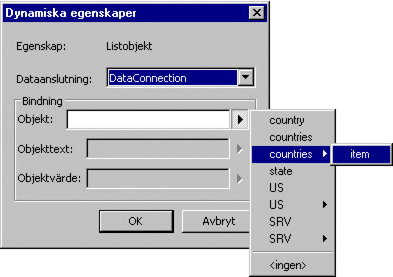 Du kan skriva strängen i rutan Objekt i stället för att välja den. Obs! Rutan Objekt är inte tillgänglig för OLEDB-dataanslutningar. Använd rutorna Objekttext och Objektvärde och välj de databaskolumner som ska användas för att fylla i listan.
