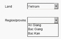 När du t.ex. har valt Vietnam i den första nedrullningsbara listan, visas bara de objekt som gäller för Vietnam i listan Stater/provinser.