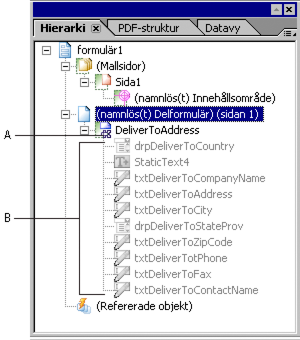 Du kan flytta en fragmentreferens och dess innehåll som en enskild enhet på paletten Hierarki på samma sätt som du flyttar andra formulärobjekt. Du kan dock inte dra objekt till en fragmentreferens.