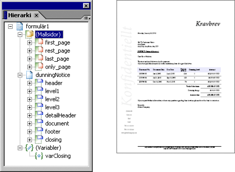 Alternativet Enda sidan (i Utskriftsformat) är användbart när det återgivna formulär kan skrivas ut på en sida av en utskriven sida. Exempelvis om två sidor skrivs ut även om alla data får plats på en utskriven sida, eftersom det finns en mallsida för den första utskrivna sidan och en mallsida för den sista utskrivna sidan i siduppsättningen, som i exemplet nedan. I exemplet visas huvudinformationen på mallsidan första_sidan och sidfotinformation på mallsidan sista_sidan.