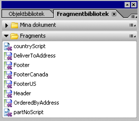 Visa paletten Fragmentbibliotek genom att välja Fönster > Fragmentbibliotek.