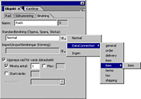 Klicka på triangeln bredvid rutan Databindning (Öppna, Spara, Skicka) och välj en bindning. Välj t.ex. objektet Dataanslutning > objekt > objekt.