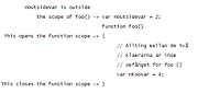 Omfång fungerar direkt utåt så att allting inom klamrar ({}) kan se utanför dem. Ingenting som ligger utanför klamrar kan dock få tillgång till något innanför klamrarna.