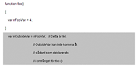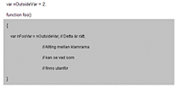 I motsats till detta visar följande exempel på ett ogiltigt omfång eftersom var nOutsideVar = nFooVar inte får tillgång till var nFooVar =4 innanför klamrarna.