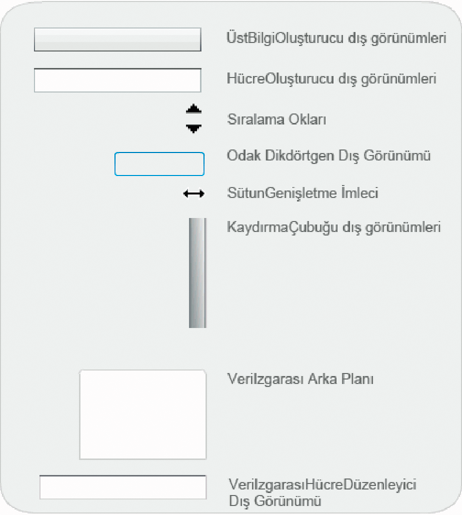 DataGrid bileşeni, görsel durumlarını temsil etmesi için şu kaplamaları kullanır: