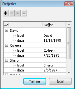 dataProvider bileşenine bir öğe eklemek için artı işaretini tıklatın. Bir öğeyi silmek için eksi işaretini tıklatın. Seçili öğeyi listede bir öğe yukarı taşımak için yukarı oku veya seçili öğeyi listede bir öğe aşağı taşımak için aşağı oku tıklatın. Aşağıdaki resimde, çocukların adlarının ve doğum tarihlerinin bir listesini oluşturan Değerler iletişim kutusu gösterilmektedir.