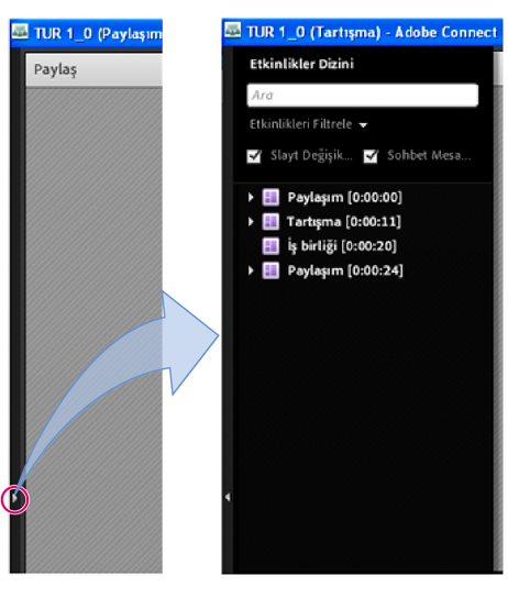Etkinlikler Dizini bölmesini göstermek için kayıtlı toplantı penceresinin solunda bulunan üçgeni tıklatın.